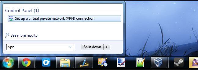 Để kết nối với VPN trên Windows 7, hãy nhấn phím Windows, nhập VPN và nhấn Enter. (Lưu ý: Nếu bạn đang sử dụng Windows 8, quá trình này sẽ rất giống nhau, nhưng một số cửa sổ có thể trông hơi khác một chút.)