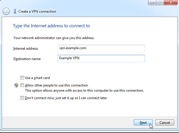 Cung cấp chi tiết kết nối cho VPN của bạn. Bạn có thể nhập bất kỳ tên nào bạn thích trong “Tên kết nối”. Tên này chỉ được sử dụng trên máy tính của bạn để giúp bạn xác định kết nối VPN.