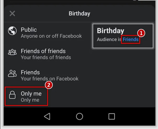 Mở rộng menu cài đặt quyền riêng tư bên cạnh ngày sinh của bạn để hiển thị menu quyền riêng tư và chọn Chỉ tôi . Bạn có thể phải nhấn vào Tùy chọn khác nếu tùy chọn không được hiển thị.