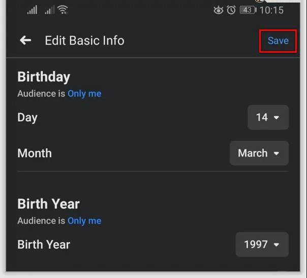 Thay đổi cả cài đặt quyền riêng tư về năm sinh của bạn. Sau khi hoàn tất, hãy nhấn vào Lưu ở phía trên bên phải của màn hình.