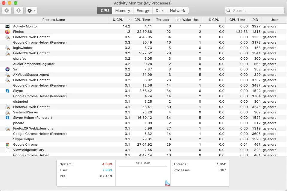 Để kiểm tra ứng dụng nào đang chạy ẩn, hãy nhấn tổ hợp phím Command + Space và nhập Activity Monitor. Nếu bạn thấy bất kỳ ứng dụng nào trong danh sách có thể đang sử dụng camera, hãy đóng ứng dụng đó trực tiếp từ Activity Monitor.