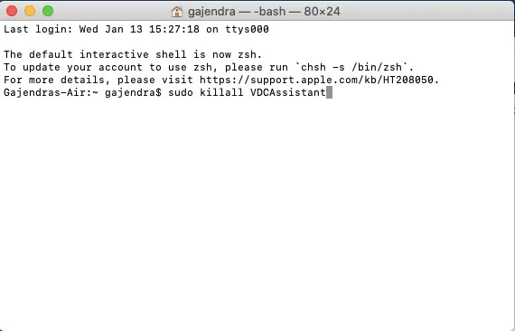 - Sau khi khởi chạy, hãy nhập: sudo killall VDCAssistant và nhấn If asked, hãy nhập mật khẩu và nhấn Enter lần nữa.