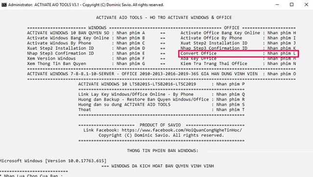 B3: Cửa sổ Activate AIO tools hiện lên, bạn nhấn phím L để Convert Office. Sau đó xem chỉ dẫn của phần mềm để nhấn các phím tiếp. Khi convert xong thì nhấn phím bất kỳ để quay lại giao diện chính.