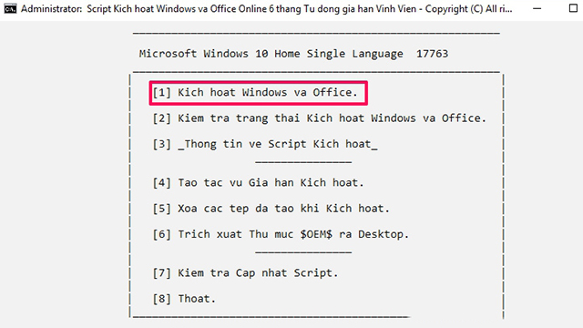 B4: Nhấn tiếp phím O và phím 1 để mở khóa Office > chọn phím số 4 để tạo tác vụ gia hạn cho bộ Office. Vậy là bạn đã crack thành công