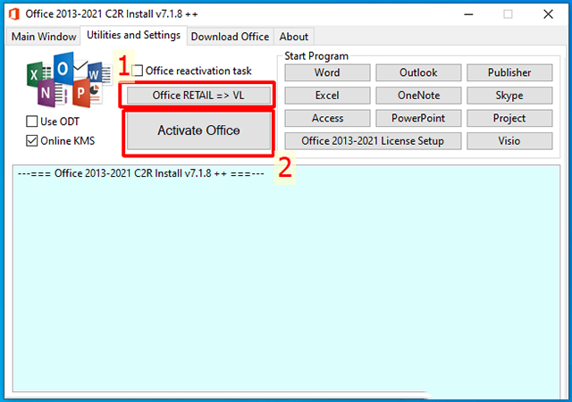 B4: chuyển sang Utilities and setting rồi chọn Office RETAIL => VL. Đợi phần mềm tự chuyển đổi, sau đó chọn Activate Office