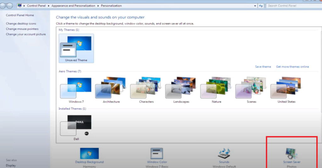 Bước 2: Trong cửa số hiện lên bạn chú ý đến góc dưới màn hình và chọn vào Screen Saver.
