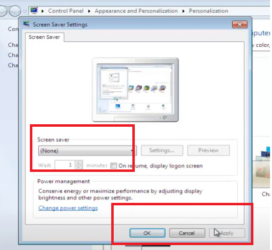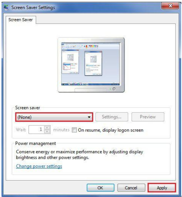 Bước 4: Hộp thoại Screen Saver Settings hiện ra. Tìm đến mục Screen saver. Nhấn mũi tên và chọn None. Sau đó nhấn Apply và OK để hoàn tất quá trình.